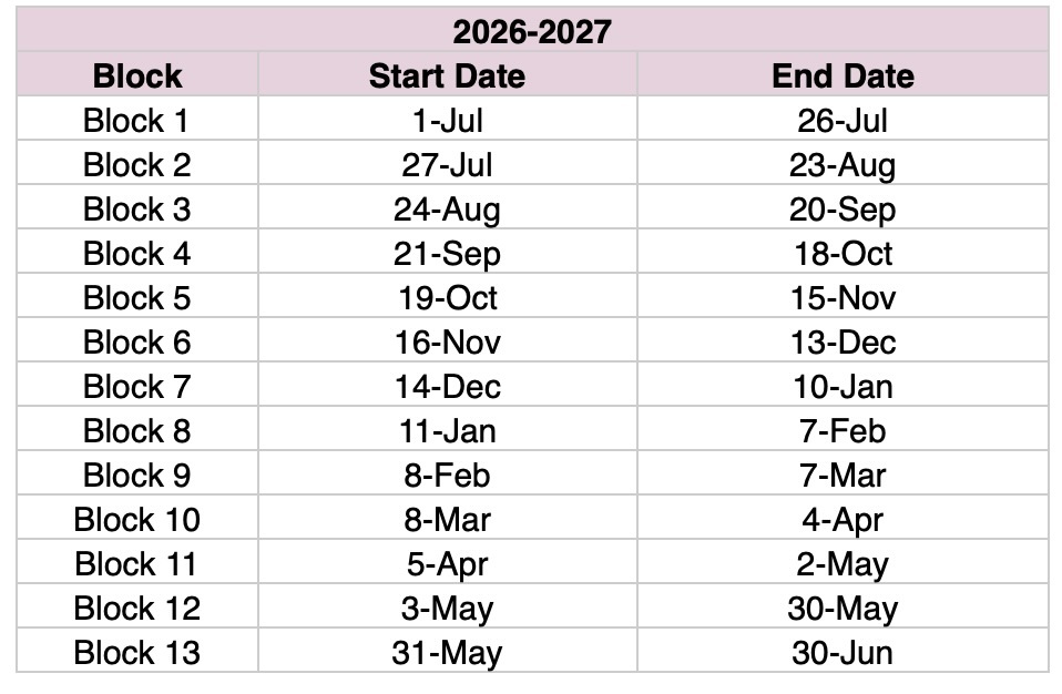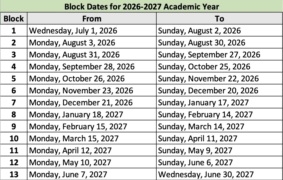 Please note that the block dates are not collectively bargained, but are instead set by the College of Medicine.